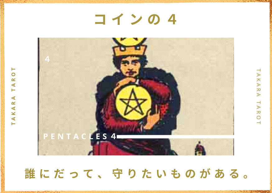4という数字は四大元素・春夏秋冬・東西南北など、物事を構成する数です。安定さを示しています。大アルカナ「4・皇帝」と関連があります。その中でのペンタクルの4はお金・物・立場etcを維持したい・守りたいということを示しています。